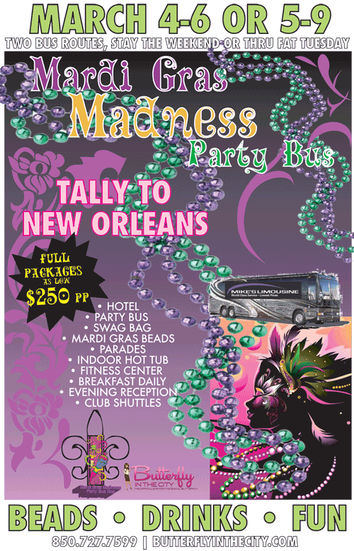 From the creative team that brought The Tallahassee Fitness Festival, and also The Tallahassee Food Festival to the Florida Panhandle comes “The Mardi Gras Madness Bus Trip”.